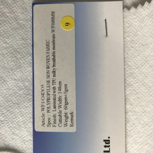 | Baigti | Finish: Laminated with TPU milky breathable membrane W/P3000MM; Svoris: 60 gsm ± 5 gsm Pjaunamas plotis: 148cm; |